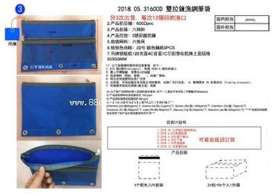 1.產(chǎn)品數(shù)量4個顏色100萬個 2.產(chǎn)品前后幅:600dpvc 3.產(chǎn)品前袋:六網(wǎng)料 4.產(chǎn)品拉鏈:3號尼龍拉鍊 5.前袋網(wǎng)料:六角網(wǎng) 6.鐵銀色雞眼:22號 銀色鷄眼3pcs 7.吊牌銅板紙120克面4c背面1c印刷穿在拉牌上面規(guī)格50x55mm 8.產(chǎn)品包裝:4個色配色入膠袋24個 4包入1外箱 出廠價不含稅