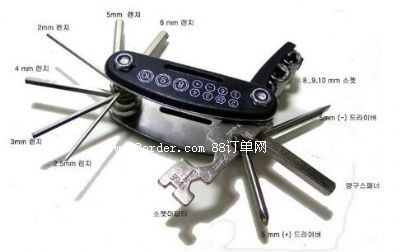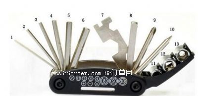 1.多用自行車維修工具: 2mm/2.5mm/3mm/4mm/5mm/6mm內(nèi)六角扳手各一支; 8mm/9mm/10mm套筒扳手各一只; "一字"/"十字"螺絲刀各一支; 8mm/10mm/15mm外六角扳手各一個; 14g輪圈輻條扳手一個.